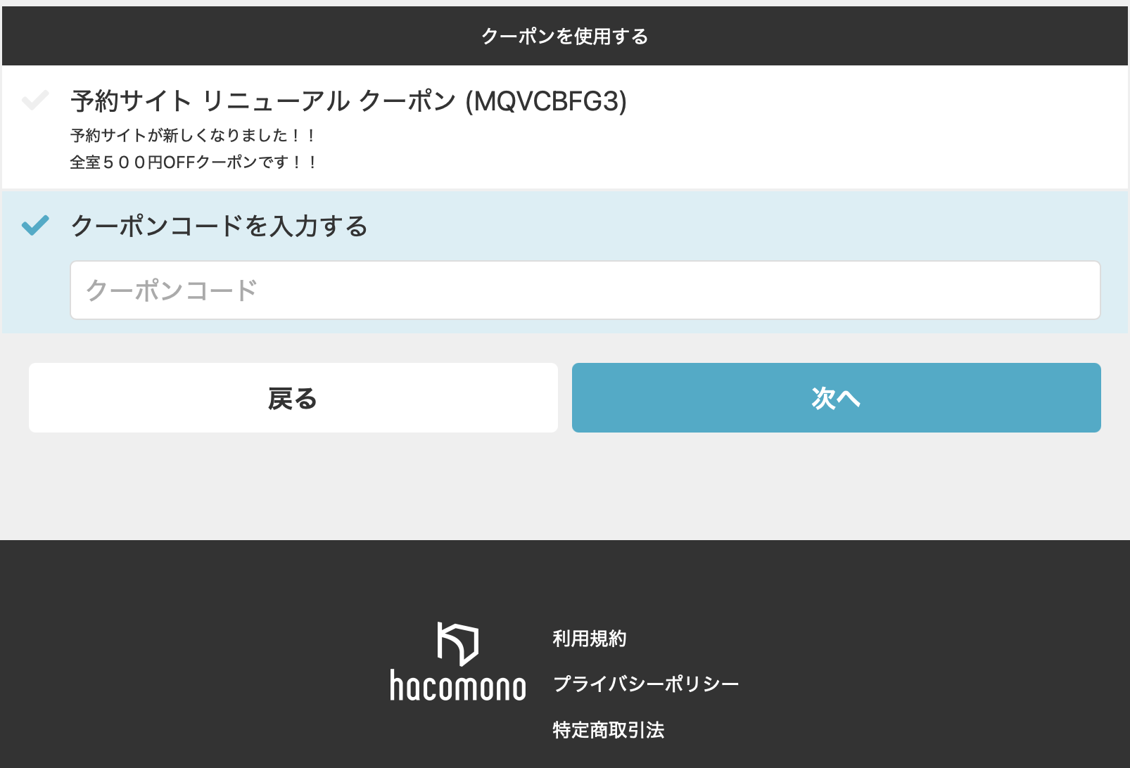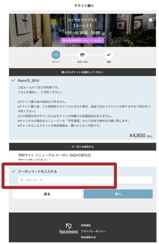 News クーポンの使い方 クーポンコードの入力の仕方を詳しく説明していきます。 キャンペーンなどで配布される【クーポンコード】が表示されます。 通常通り、ひとりサウナプラスの予約サイトで 日程を指定し、「チケットを購入して予約する」 ↓ チケット購入画面の最下部にある 「クーポンコードを入力する」の欄にクーポンコードを入力します。 これでクーポンが適用になった金額で決済が可能になります。 ※クーポンコードはお一人様一回までご利用可能です。 « 予約サイトリニューアルについて お年玉クーポン開催🧧 »